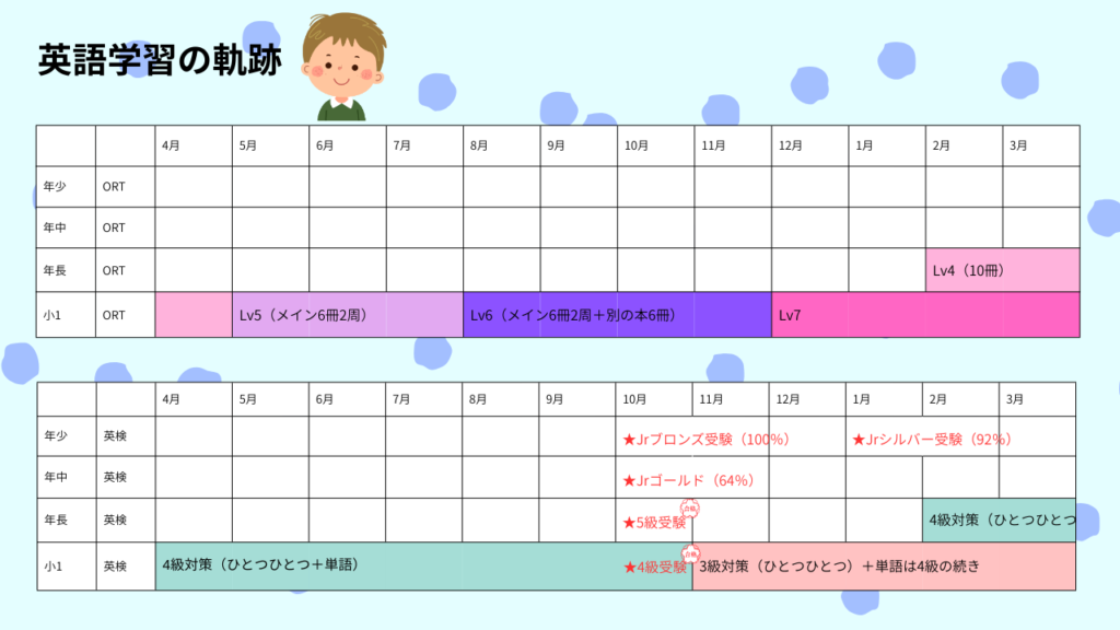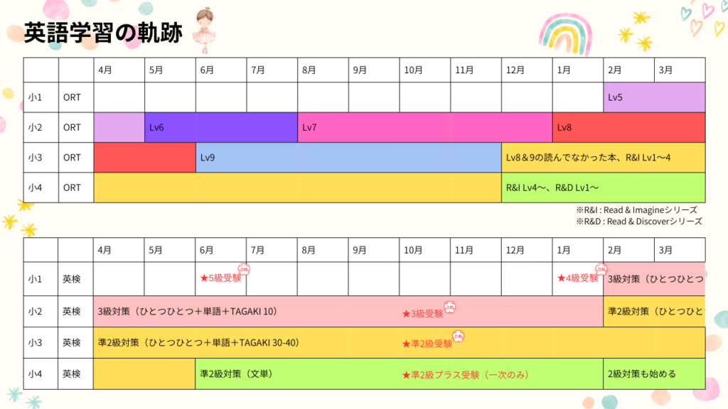 小1の終わりから今も続けているオンラインスクールに出会い、レッスン開始。色がついているところがオンラインスクールに入ってからのカリキュラムです。